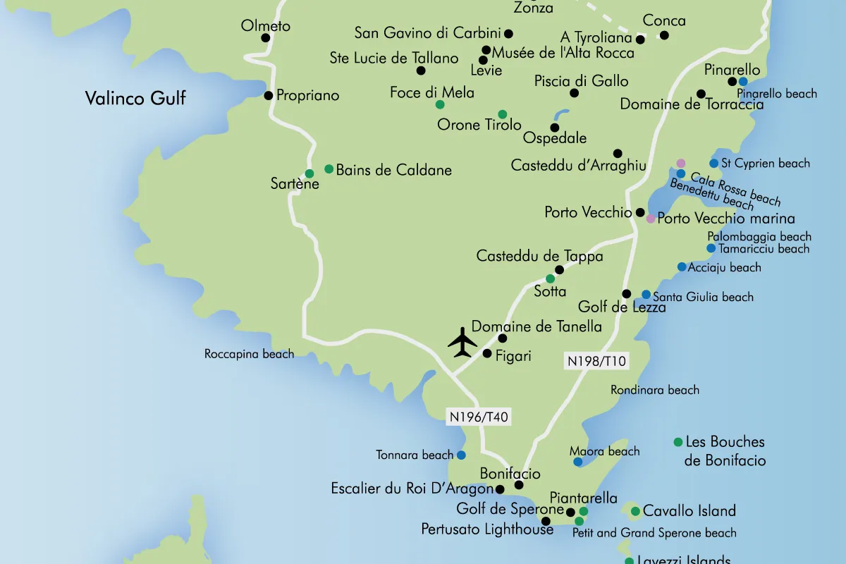 On the N196/T40 north from Bonifacio. The beach is signposted to the left, adjacent to a large, free car park.