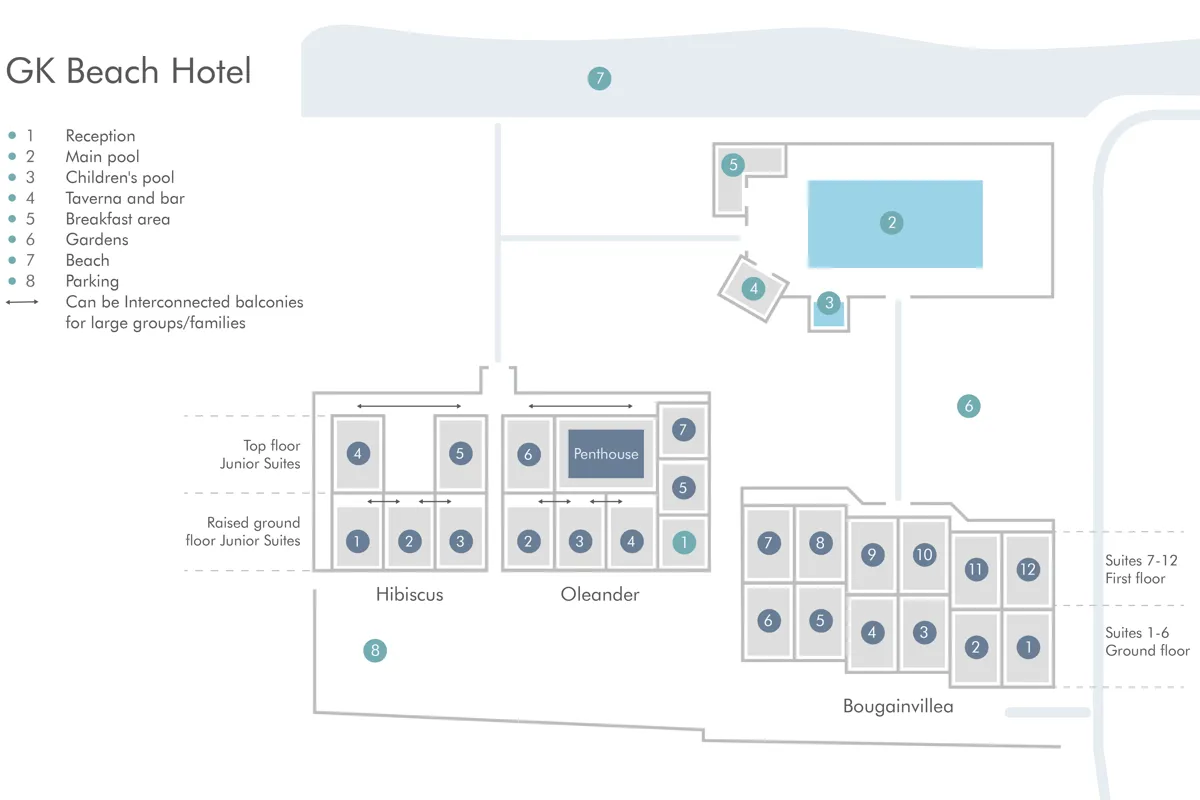 - All Hibiscus and Oleander junior suites can be adapted to interconnect via the balconies to sleep families of four to six