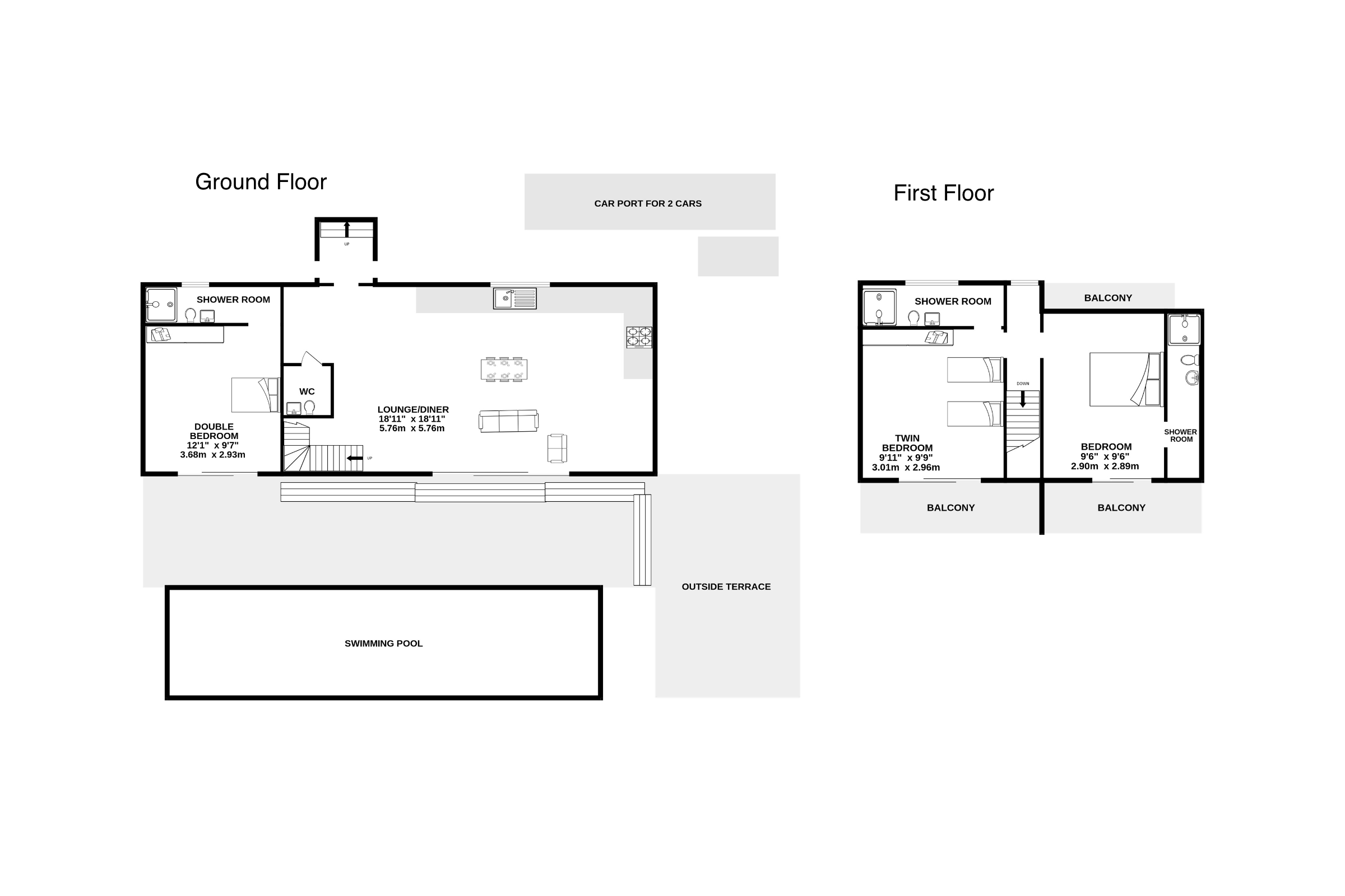- Twin bedroom (2 x 90cm beds) with en-suite shower room with WC and basin; leads to balcony