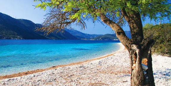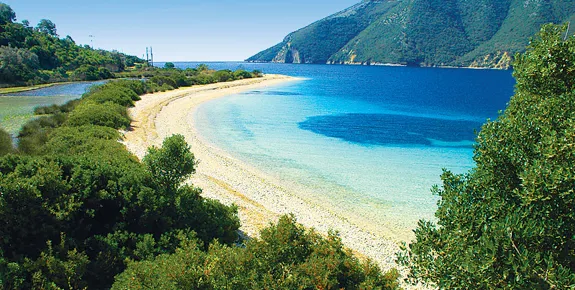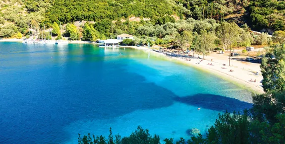 On a spit of land protruding into the Meganissi Channel, opposite Thilia Island, Stravnam is a gently sloping beach with small stones and great views: see the sun set behind Lefkada.